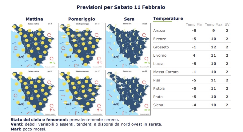 Sabato 11 febbraio è prevista una giornata com meteo stabile, cielo prevalentemente sereno e venti deboli.
