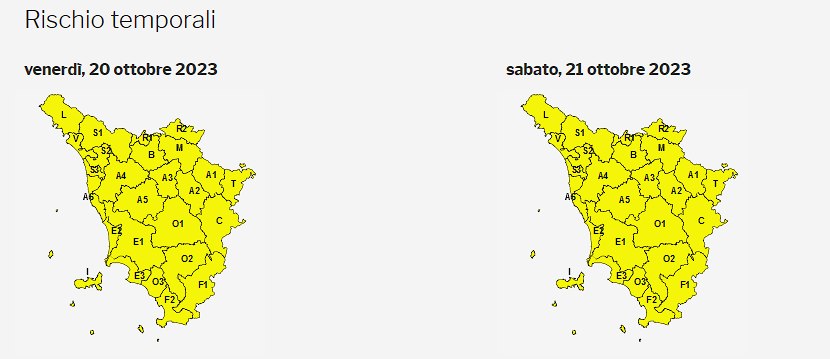 Per tutta la giornata di oggi, venerdì 20 ottobre, e fino alle 18 di domani, sabato 21 ottobre, su tutta la Toscana saranno probabili rovesci e temporali sparsi, localmente forti. Per questo la sala di controllo della protezione civile della Regione Toscana ha emanato il codice giallo. Sia per temporali che per rischio idrogeologico, è esteso a tutta la Toscana.
