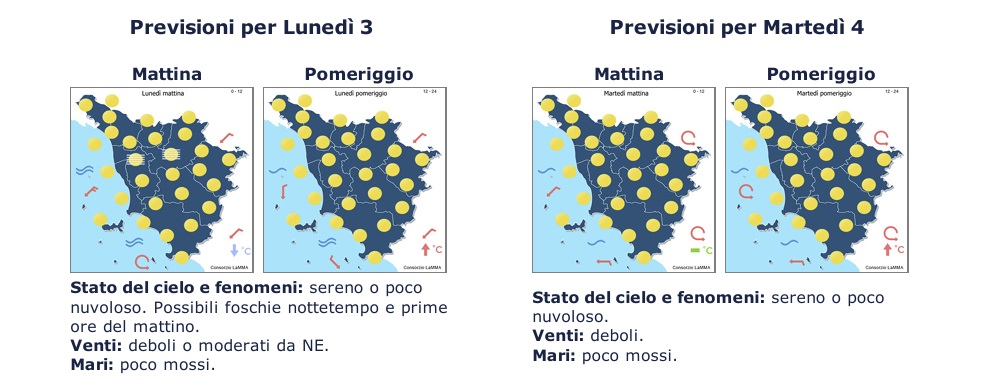 Da lunedì 3 marzo torna a splendere il sole: venti deboli da nord-est e mari poco mossi. Medesime condizioni previste per martedì 4 marzo: sereno o poco nuvoloso, venti deboli e mari poco mossi.