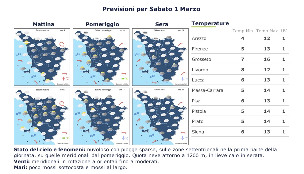 Per sabato 1 marzo le nuvole continueranno ad accumularsi, fino alla pioggia del primo pomeriggio praticamente sia sulla costa che nelle zone interne. Venti in rotazione di quadranti orientali, mari poco mossi e temperature stazionarie: dai 7 ai 16 gradi.