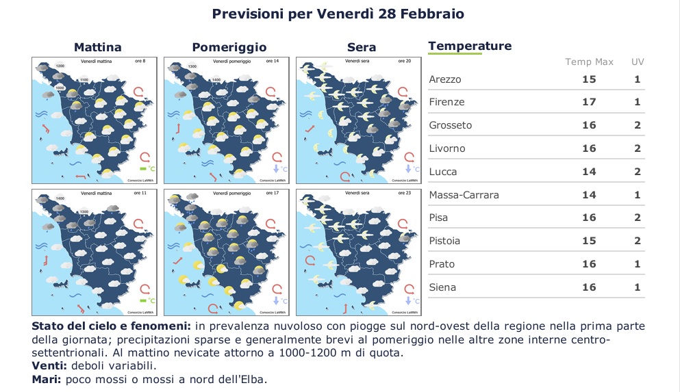 Per questo venerdì 28 febbraio cielo nuvoloso, con un miglioramento dal pomeriggio sulla costa, Venti deboli da direzione variabile, mari poco mossi, con la temperatura massima fino a 16 gradi.