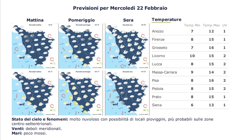 GROSSETO. Aumento delle nuvole nei prossimi giorni in Maremma. Secondo le previsioni del Consorzio Lamma, già da mercoledì mattina il cielo sarà coperto e molto nuvoloso con l’arrivo di isolate pioviggini dalla tarda serata, soprattutto sulla costa. Venti in rotazione da sud anche se deboli. Giovedì 23 febbraio ancora molto nuvoloso, con qualche schiarita nella provincia di Grosseto. Temperature stabili dai 6 le minime ai 15 gradi le massime.