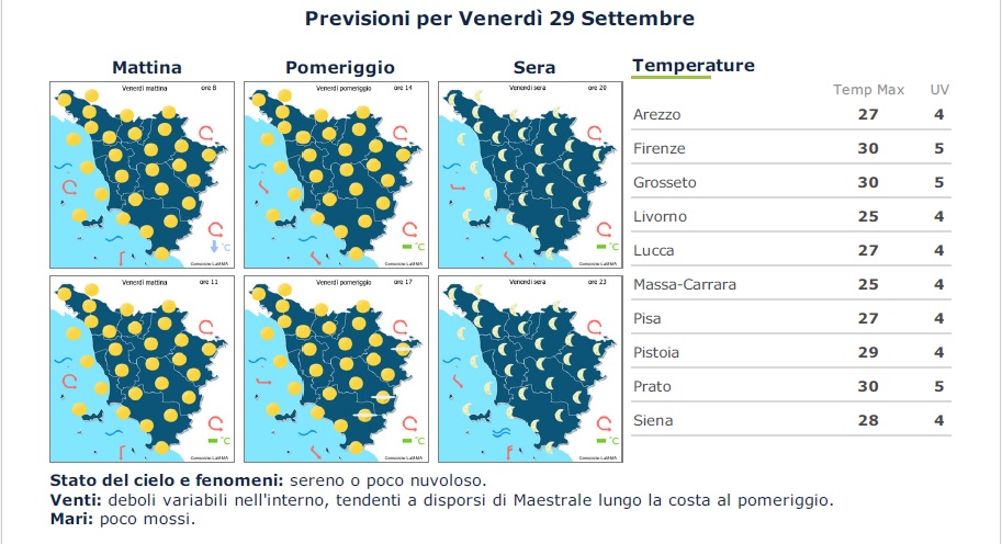 Continua l’alta pressione e meteo stabile. Sabato 30 le temperature massime sono previste costanti e i venti deboli e variabili, mari poco mossi.