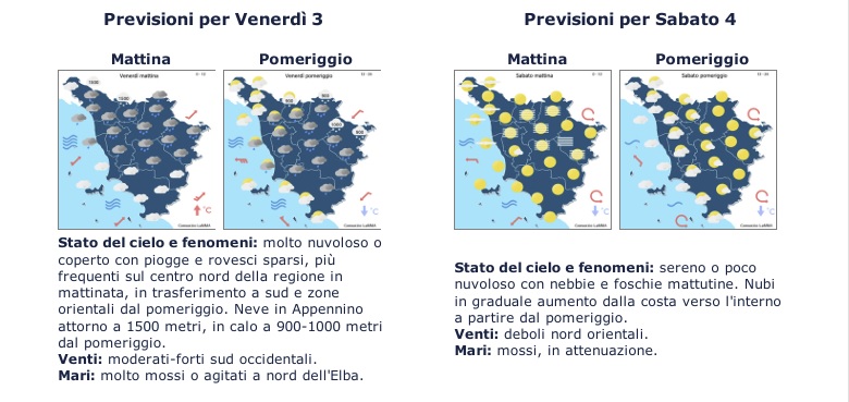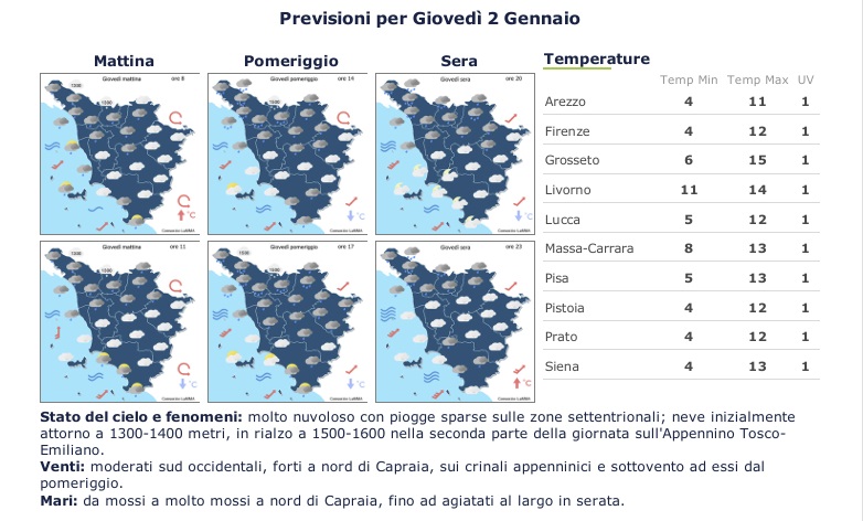 Per venerdì 3 gennaio ancora molto nuvoloso, con qualche pioggia nelle zone collinari. Venti moderati in tendenza a intensificarsi. Mari molto mossi. Per sabato 4 gennaio generale miglioramento con tendenza al ritorno delle nubi dal pomeriggio. Venti nord orientali, mari mossi in attenuazione.