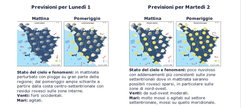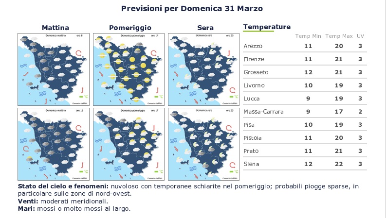 Peggioramento per lunedì 1 aprile, giorno di pasquetta: alta probabilità di pioggia su tutta la provincia, con rapido miglioramento dal pomeriggio. Venti forti dai quadranti occidentali, mari agitati. Deciso miglioramento da martedì 2 aprile: poco nuvoloso, e sole nel pomeriggio. Venti da sud-ovest, mari mossi.