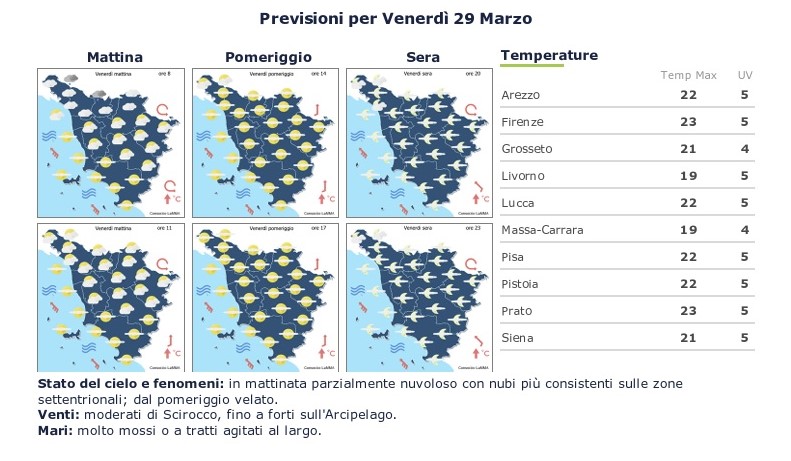 Già da questo Venerdì Santo 29 marzo, il cielo rimarrà velato con i venti sempre di scirocco e temperature massime ormai costantemente sopra i 20 gradi. Il mare rimane sempre molto mosso.