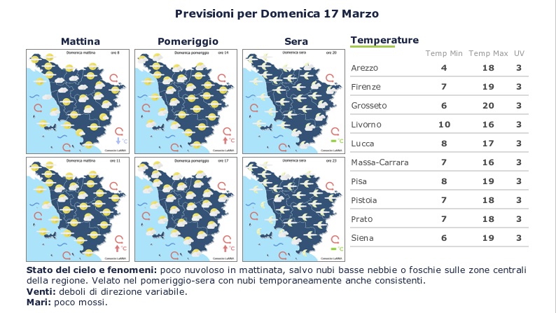 Situazione stabile per domenica 17: cielo poco nuvoloso in mattinata e anche durante il pomeriggio. Venti da direzione variabile, e ancora in aumento le temperature massime che raggiungeranno i 20 gradi. Mari poco mossi.