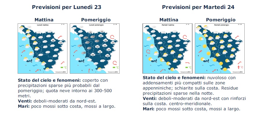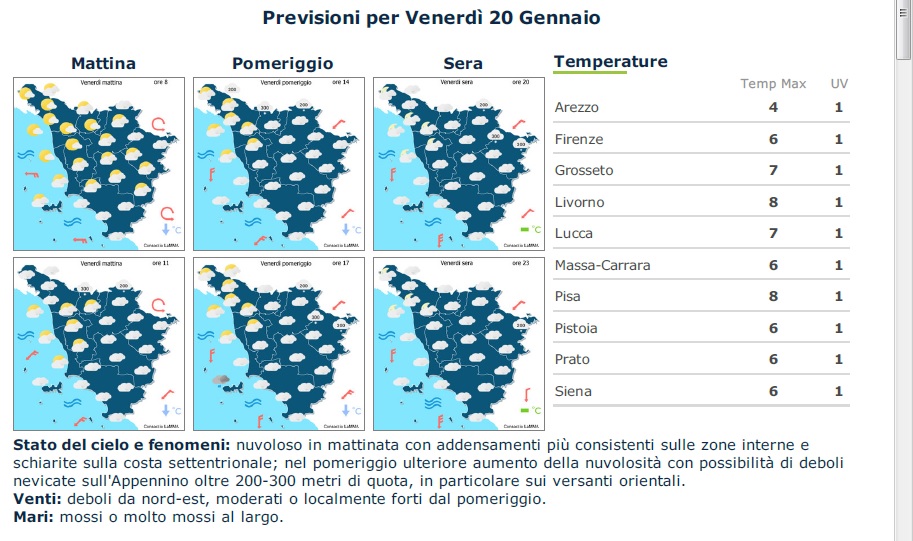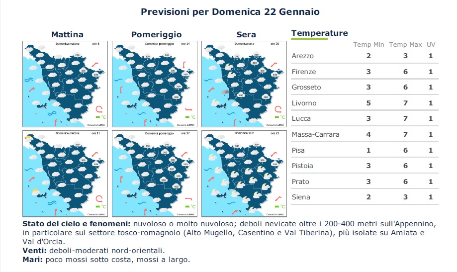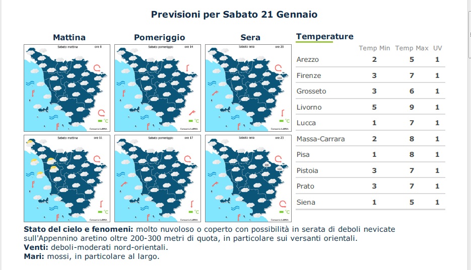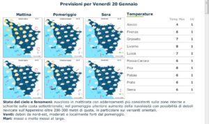 GROSSETO. Un fine settimana ancora pieno di nuvole in Maremma: secondo le previsioni del Consorzio Lamma la situazione rimane stabile, con il cielo molto nuvoloso ma senza pioggia. Medesime condizioni per sabato: ancora una consistenza di nubi, con venti moderati dai quadranti orientali. Coperto anche domenica, e forse qualche spruzzata di neve sul monte Amiata. Leggero miglioramento a partire da lunedì con il sole che dovrebbe fare capolino, mentre per martedì tornerà il bel tempo. Le temperature rimangono rigide.