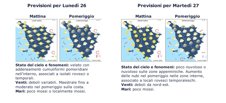 Simili condizioni per martedì 27 agosto, con probabilità di qualche rovescio sparso, nelle zone interne dell’Amiata, nel pomeriggio. Venti da nord-est e mari poco mossi.