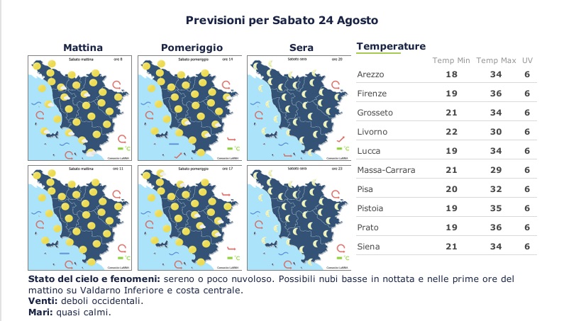 Sereno o poco nuvoloso per sabato 24 agosto: venti dai quadranti occidentali e mari quasi calmi. Temperature stabili: 21 gradi la minima, 34 gradi la massima.