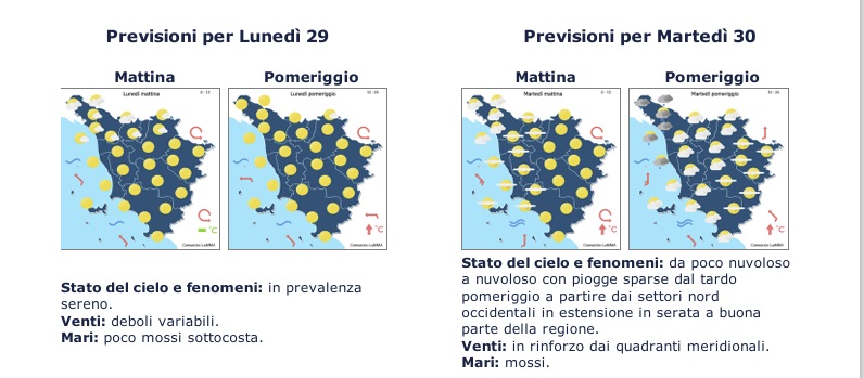 Deciso miglioramento da lunedì 29 aprile con le previsioni che danno una giornata serena e venti deboli con mari poco mossi. Martedì 30 aprile poco nuvoloso, con venti dai settori nord occidentali in rinforzo e mari mossi.