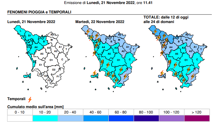 - Pioggia: dal tardo pomeriggio di oggi, lunedì 21 novembre, arriveranno piogge sulle zone nord-ovest. Si estenderanno gradualmente in serata/nottata al resto della regione. Nel corso della mattina di domani, martedì 22, le precipitazioni rimarranno più sparse sulla costa, ma ancora diffuse nell’interno. Dal pomeriggio le condizioni meteo tenderanno a migliorare.