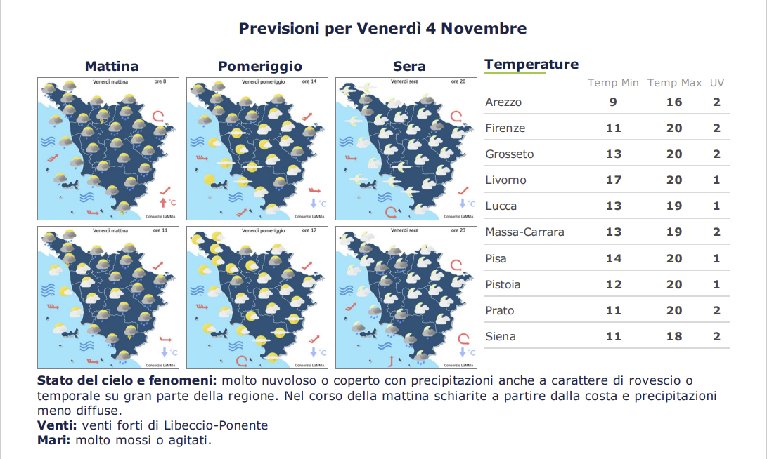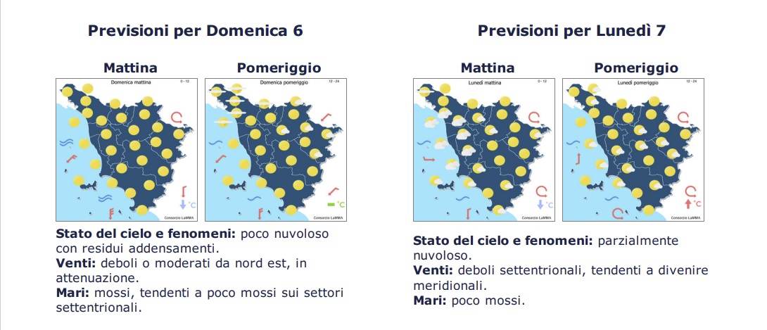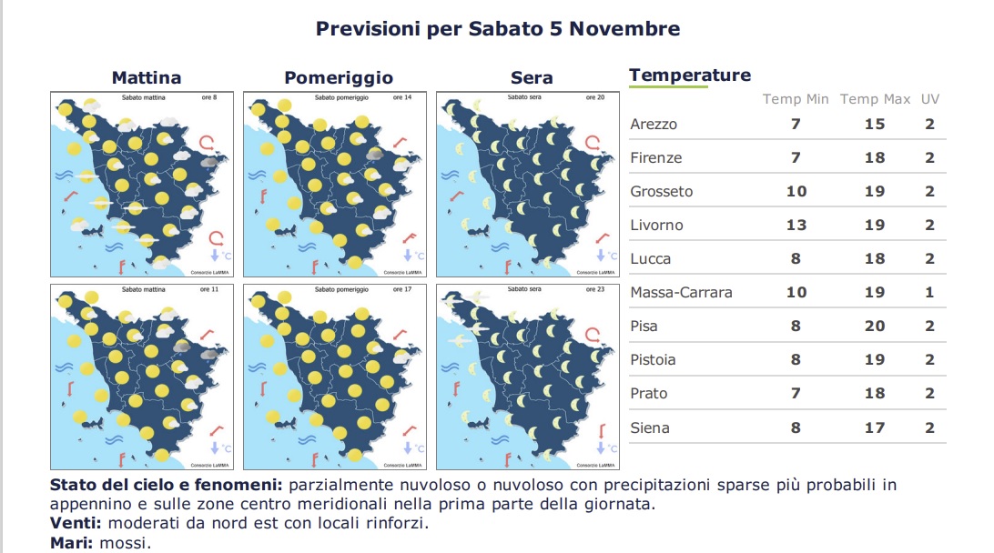 GROSSETO.  Le burrasche di metà settimana, almeno nelle zone interne della Maremma, lasceranno spazio al ritorno del sole nel fine settimana. Le previsioni del Consorzio Lamma prevedono già da sabato cielo sereno su tutta la costa e nell’interno, con le temperature e venti moderati da nord est con locali rinforzi. Stesse previsioni per domenica e lunedì prossimo, con un calo delle temperature minime, e i mari che rimarranno poco mossi. Una situazione stazionaria che dovrebbe continuare anche per le prossime settimane, almeno fino a metà novembre.