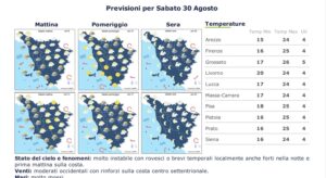 Deciso peggioramento per sabato 30 agosto. Fin dalla notte di prima mattina probabilità di precipitazioni o brevi temporali, anche forti. Venti moderati da ovest in rinforzo. Mari molto mossi. Temperature in lieve diminuzione da 16 ai 26 gradi la massima.