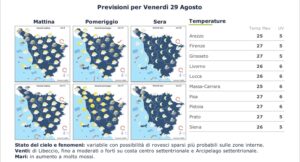 Situazione in evoluzione venerdì 29 agosto. Possibilità di rovesci soprattutto nelle zone interne. Venti di libeccio e forti sulla costa. Mari molto mossi. Temperature massime fino a 27 gradi.