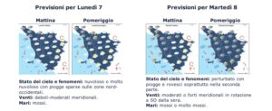 Per l’inizio della prossima settimana in arrivo le nuvole. Per lunedì 7 ottobre cielo coperto su tutta la Maremma con venti moderati dai quadranti meridionali e mari mossi. Deciso peggioramento è previsto per martedì 8 ottobre: in serata ci potrebbe essere l’arrivo della pioggia, con venti in rotazione da sud e mari mossi.