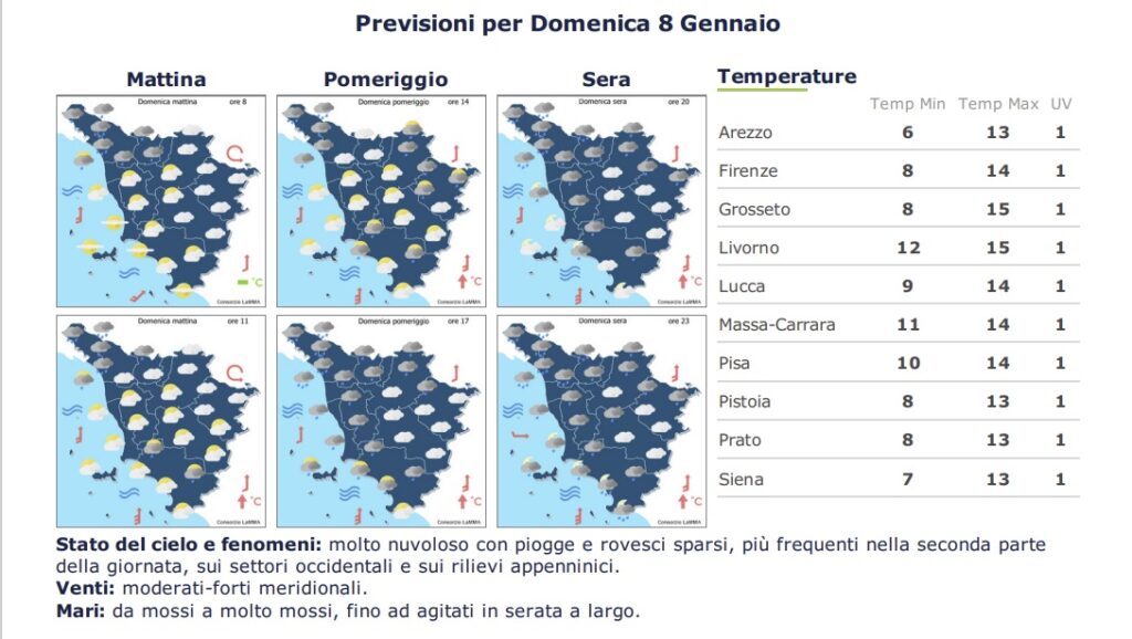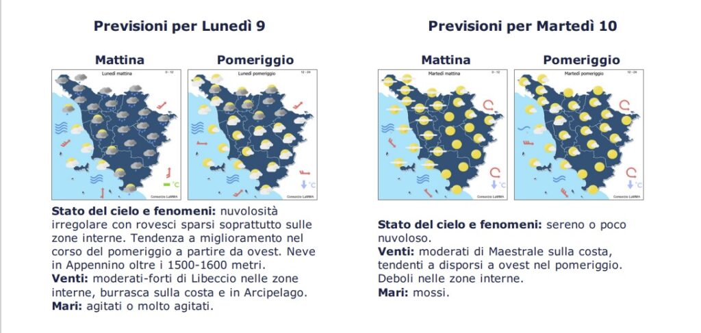 Domenica 9 invece deciso peggioramento con piogge e rovesci sparsi più probabili dal pomeriggio.