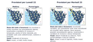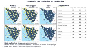 Deciso peggioramento da lunedì 22 settembre. Le previsioni annunciano l’arrivo delle nuvole e alta probabilità di rovesci sparsi su tutta la costa per estendersi alle zone collinari. Venti di scirocco, mari mossi. Ancora nuvolosità per martedì 23 settembre, con un miglioramento in Val di Cornia, mentre in Maremma probabilità di pioggia che si sposterà nelle zone interne. Venti in rotazione di libeccio, mari mossi.