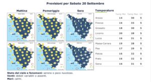 Situazione stabile sabato 20 settembre. Cielo sempre sereno o poco nuvoloso, venti deboli o assenti, mari calmi. Temperature stazionarie con le massime fino a 30 gradi.
