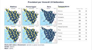 Sereno o poco nuvoloso questo venerdì 19 settembre con cielo sereno. Venti deboli, mari calmi. Temperature stabili.