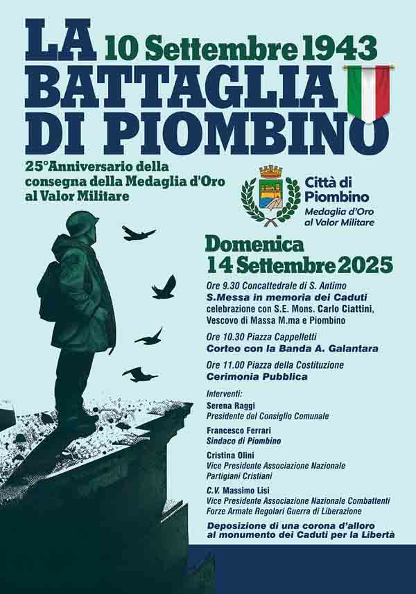 Il Comune di Piombino, in occasione dell’anniversario della Battaglia di Piombino del 10 settembre 1943 e del 25° anniversario della consegna della medaglia d’oro al valor militare, ha organizzato per domenica 14 settembre una giornata di celebrazioni.