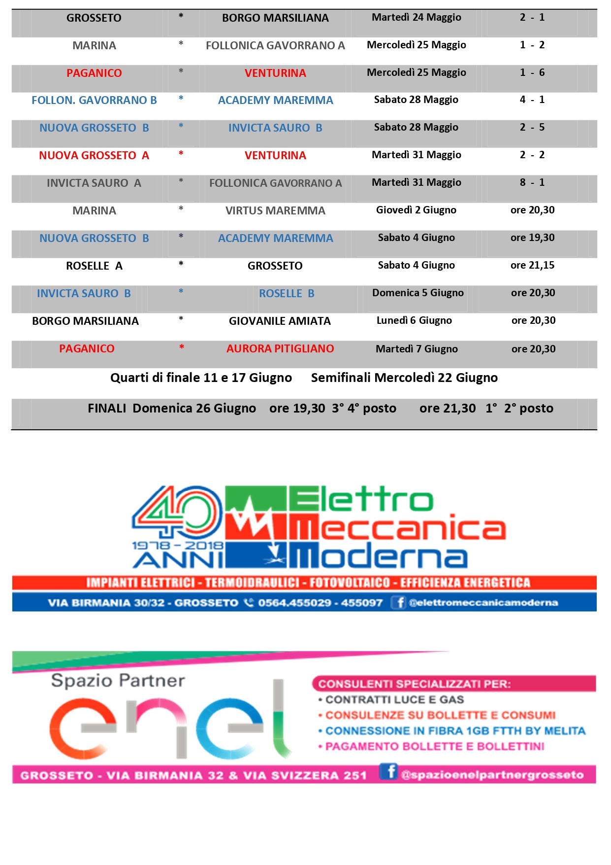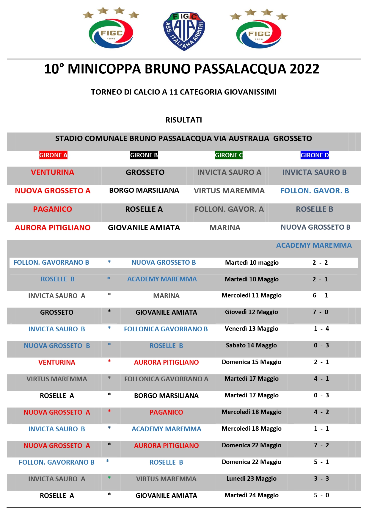 Girone C: Invictasauro A 7, Virtus Maremma 4, Follonicagav. 3, Marina 0