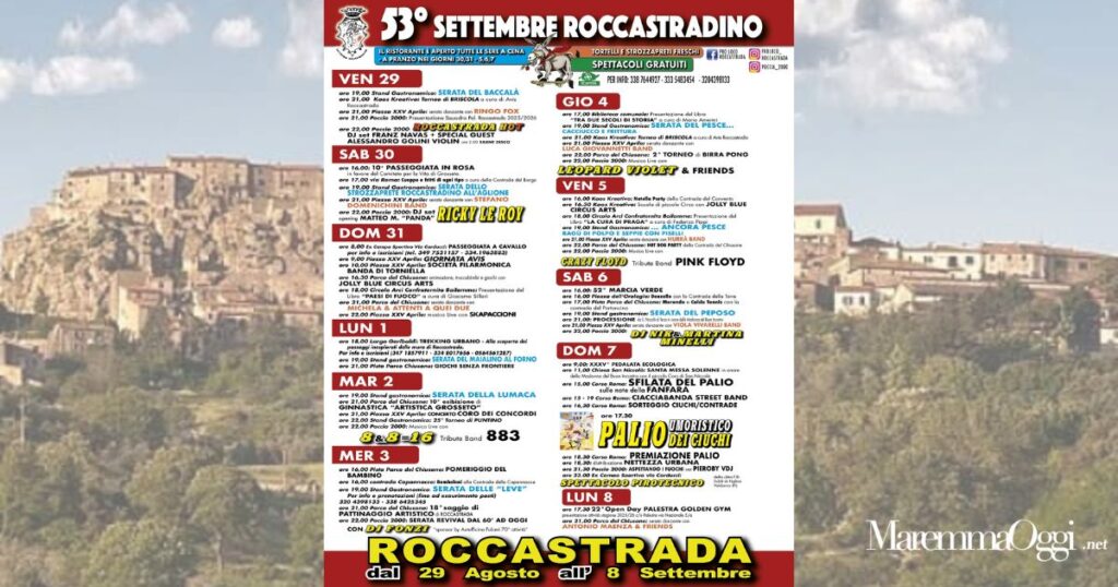 Il Settembre Roccastradino andrà avanti con altri appuntamenti tutti i giorni fino a lunedì 8 settembre. Il ristorante è aperto ogni sera per la cena a base di prodotti tipici locali, mentre sarà aperto a pranzo nei giorni 5-6 e 7 settembre.