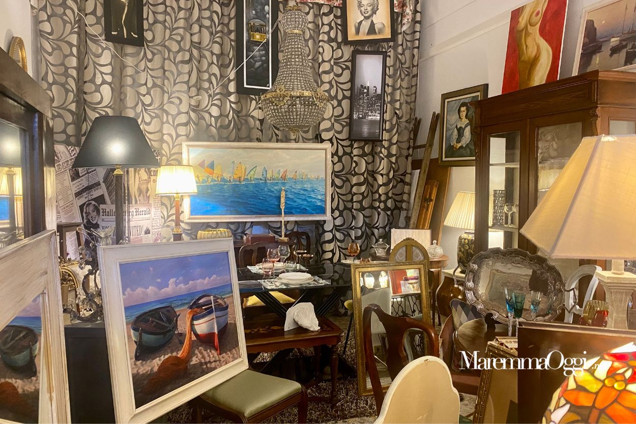 Nel mondo di Giovanni si trovano articoli di bigiotteria vintage e artistici, meravigliosi quadri di tutti i colori e misure, specchi artigianali con cornici solenni, lampade vecchie e di design, mobili di antiquariato, materiali di recupero come cementine e graniglie d’epoca fatte a Follonica, sheffield e argenti. Nonostante questa vastissima varietà di oggetti, niente è posizionato a caso: sembra che tutto sia perfettamente al suo posto, andando a riempire lo spazio perfetto destinato a lui.