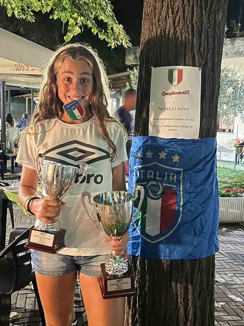 Anna Nerelli al circolo Colle degli Dei di Velletri è stata fantastica. Due settimane fa ha vinto il torneo internazionale. E nell’ultimo fine settimana ha portato a casa il titolo di doppio, con Ludovica Casalino e ha perso solo in finale nel singolo, laureandosi vice campionessa italiana.