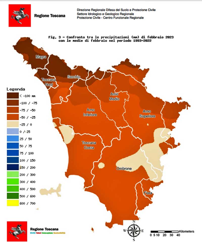 Rispetto al triennio precedente il deficit pluviometrico nel bacino del Fiora è del 62% (corrispondente a circa 42 mm in meno), del Po -64% (corrispondente a circa 73 mm in meno), dell’Ombrone-GR -52% (corrispondente a circa 33 mm in meno), dell’Arno -54% (corrispondente a circa 43 mm in meno), del Tevere -51% (corrispondente a circa 40 mm in meno), del Magra -74% (corrispondente a circa 104 mm in meno), del Serchio -66% (corrispondente a circa 85 mm in meno). I bacini della costa toscana vedono un -51% (corrispondente a circa 33 mm in meno) ed infine i bacini della Versilia registrano -67% (corrispondente a circa 92 mm in meno).