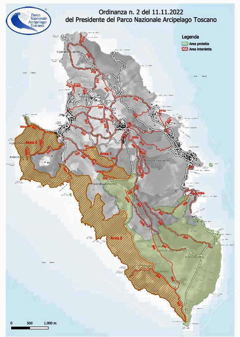 Il provvedimento stabilisce che nei periodi temporali compresi tra la data odierna e il 16.12.2022 e tra il 09.01.2023 e il 28.02.2023 sarà vietato a chiunque l’accesso nelle due aree del Parco Nazionale situate nel settore centrale e occidentale/sud-occidentale dell’Isola del Giglio ed evidenziate nella mappa allegata, in particolare: