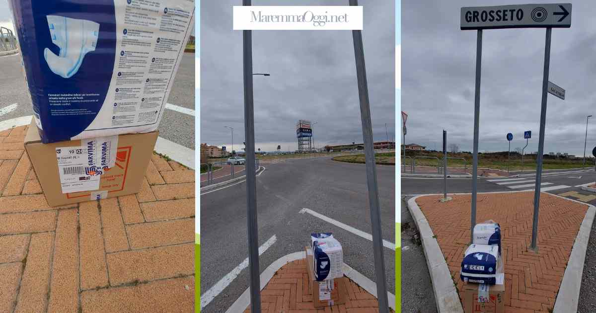 GROSSETO. Erano impilati con cura sotto al cartello che indica il centro di Grosseto, sul marciapiede di una delle rotonde che, dalla città, porta all’area commerciale Maremà. Per la precisione arrivando da via Australia e dalla zona dell’ospedale. Uno scatolone di cartone contenente medicinali o altri prodotti per farmacia e sopra due pacchi di pannoloni per adulti.