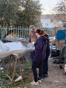 Durante la visita troviamo al lavoro i volontari del rione: oltre a Gian Mauro, Floro Salvini e sua figlia Elisa, Nicola Biagiotti, Cristina Borelli e Angelica Scalise la direttrice artistica nonché bozzettista del rione, mentre il presidente è Cristiano Battisti.