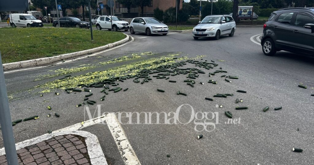 GROSSETO. Traffico in tilt, questa mattina, 2 maggio, per un carico di zucchine caduto da un camion per strada. È successo in viale Sonnino, alla rotonda delle “Quattro strade“, punto nevralgico per lo scorrimento della viabilità cittadina.