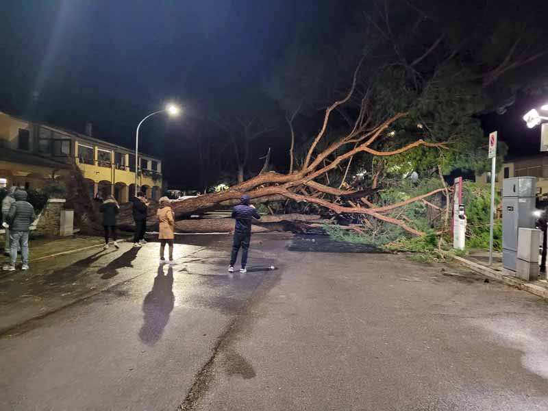 Anche nella piazza nel cuore di Rispescia, un pino è crollato pericolosamente, andando ad occupare la strada.