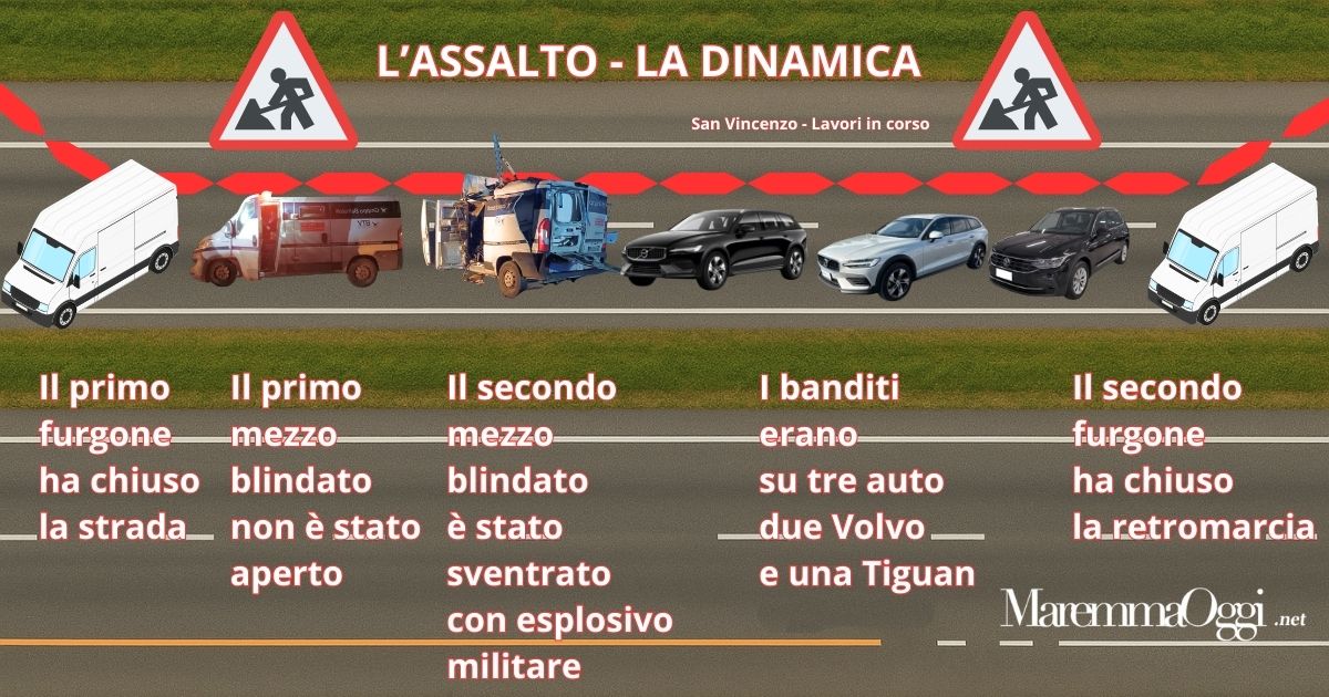 Il camper ha sorpassato i mezzi blindati e, all’altezza del restringimento della carreggiata, ha frenato fino a fermarsi, costringendo le guardie giurate alla guida dei blindati a fare lo stesso. Il furgone per il trasporto dei cavalli ha chiuso l’uscita in retromarcia, mettendo in trappola i mezzi della Battistolli.