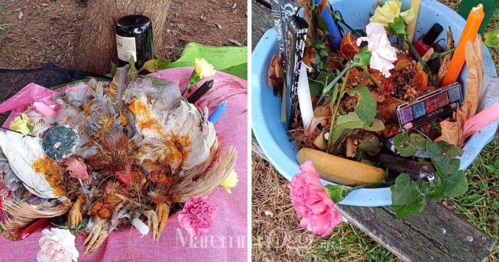 Dopo la segnalazione di mercoledì, giovedì una pattuglia è intervenuta nel solito posto del giorno prima ritrovando di fatto una cosa simile a quella del giorno prima; un cesto con un pollo fatto a pezzi, candele, un ventaglio, polvere dorata e alcuni doni intatti come uno smalto per unghie.