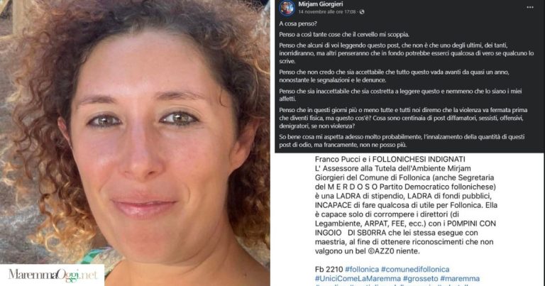 FOLLONICA. Alzare l’asticella, così tanto da fare paura. Dal passare dalla diffamazione alla persecuzione. È quello che sta succedendo a Follonica, dove rappresentanti delle istituzioni, politici, giornalisti, giorno dopo giorno … Leggi tutto Post contro l’assessora: «È persecuzione e vi spiego perché»