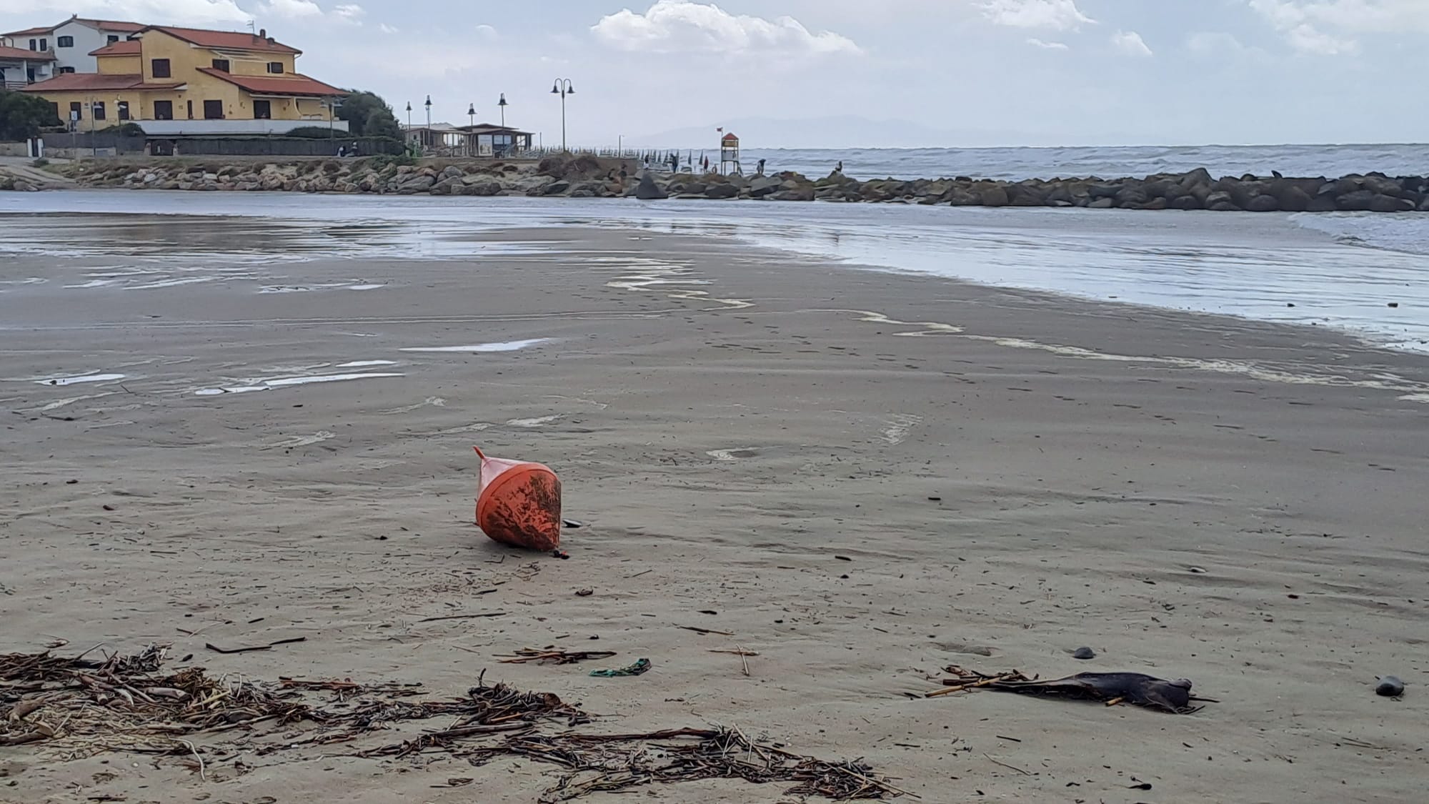 Una boa, rimasta sulla spiaggia di Castiglione, lascia immaginare quanto impetuosa possa essere stata la mareggiata sul litorale. Anche se gli stabilimenti nelle zone vicino al paese non sembrano essere stati particolarmente colpiti.
