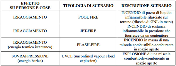 Gli scenari incidentali di riferimento sono quelli discendenti da eventi iniziatori (Top event) riguardanti essenzialmente la dispersione di Gnl (gas naturale liquefatto) o di Gn (gas naturale) con successivo innesco della miscela combustibile-aria. Gli scenari incidentali possono pertanto degenerare nella tipologia di cui alla seguente tabella.