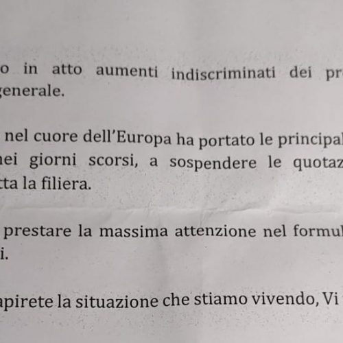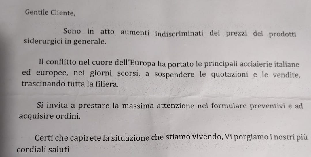 Le circolari, infatti, fotografate con estrema rabbia e rassegnazione, hanno tutte lo stesso tono: “Gentile cliente, sono in atto aumenti indiscriminati dei prezzi dei prodotti siderurgici in generale. Il conflitto nel cuore dell’Europa ha portato le principali acciaierie italiane ed europee, nei giorni scorsi, a sospendere le quotazioni e le vendite, trascinando tutta la filiera. Si invita a prestare la massima attenzione nel formulare preventivi e ad acquisire ordini. Certi che capirete la situazione che stiamo vivendo, Vi porgiamo i nostri più cordiali saluti”.