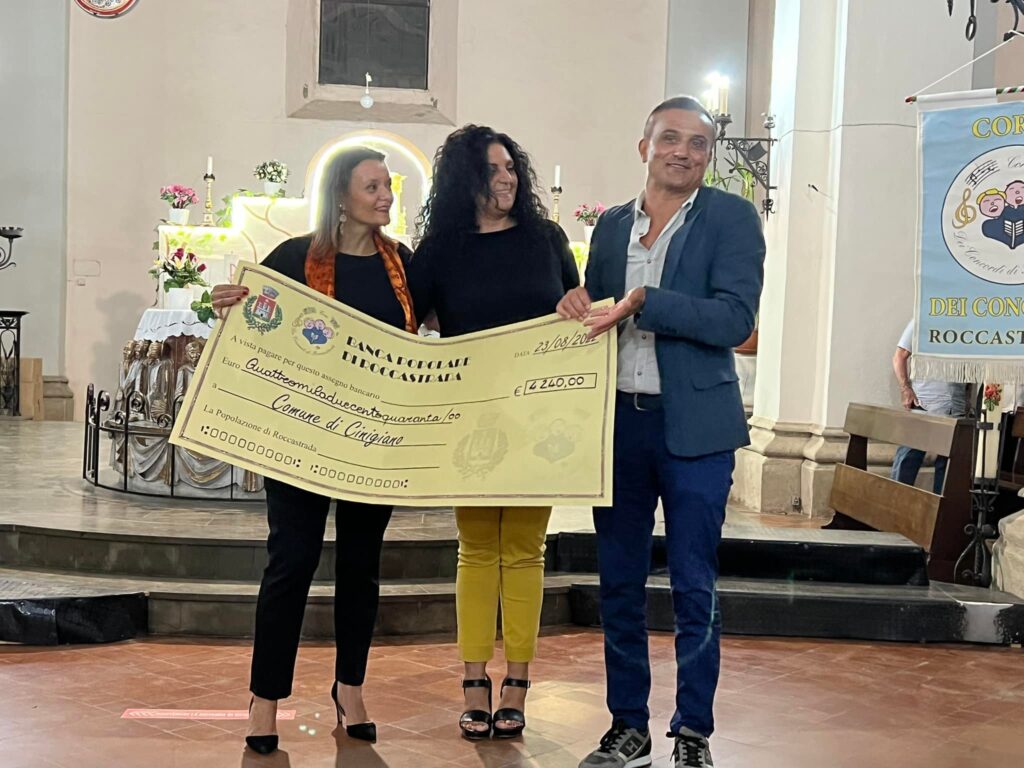 ROCCASTRADA. Martedì 23 agosto, a margine del concerto che ha tenuto il coro dei Concordi, diretto dal maestro Stefano Pioli, nella gremita chiesa di San Niccolò di Roccastrada il sindaco di Roccastrada Francesco Limatola e la presidente del coro dei Concordi Elisabetta Marzocchi hanno consegnato alla sindaca di Cinigiano Romina Sani, un assegno simbolico con l’importo ricevuto in donazione da cittadini e associazioni del comune di Roccastrada pari a 4240 euro.