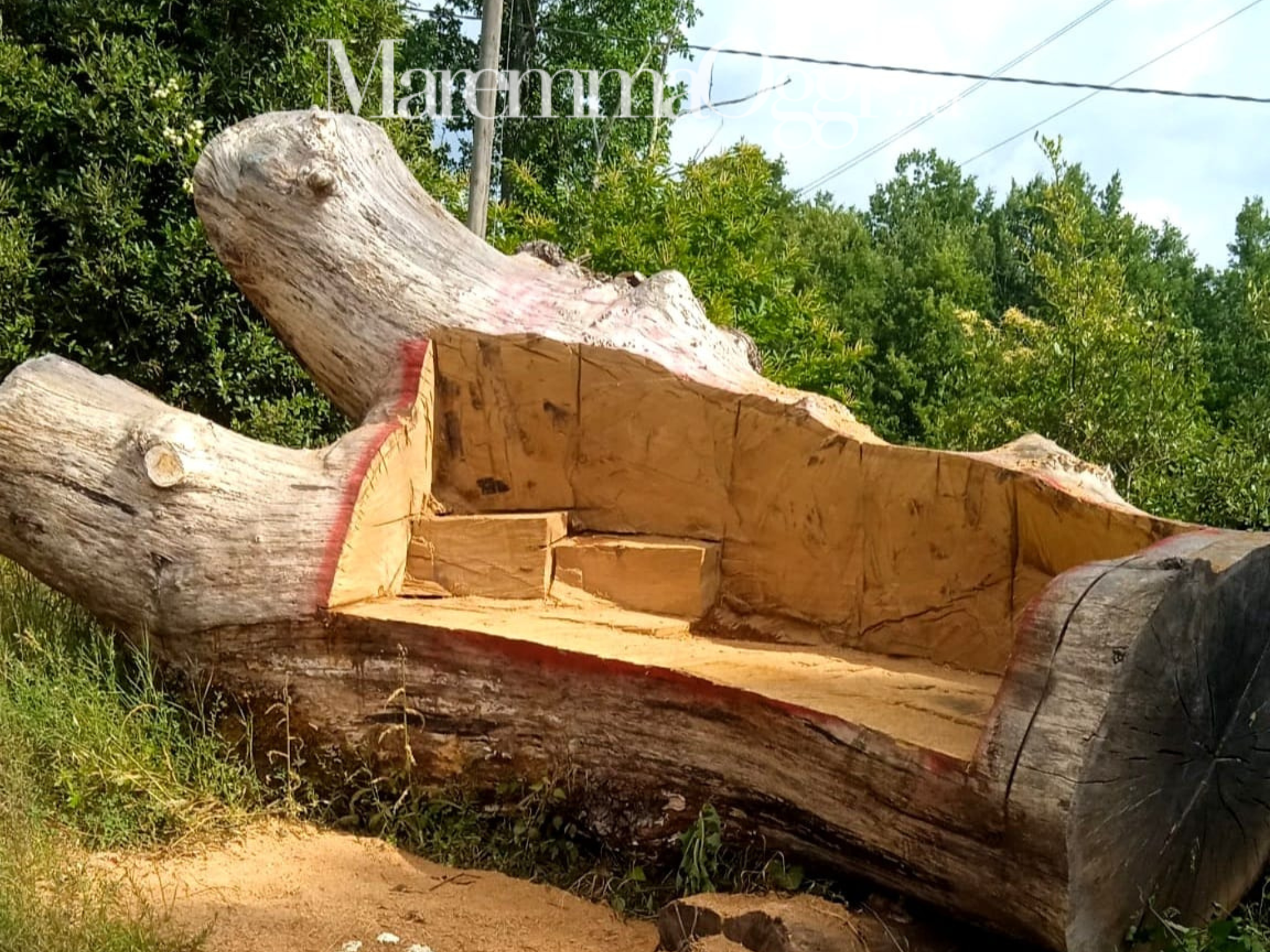 Ruggero ha realizzato la sua opera in tre pomeriggi di lavoro, a ottobre e dicembre 2022, usando motoseghe di dimensioni diverse, con la punta più o meno sottile, in base al dettaglio da raggiungere. Così, il tronco, lungo circa 5 metri e con un diametro di 140 centimetri nella parte più stretta, si è trasformato in un enorme divano.