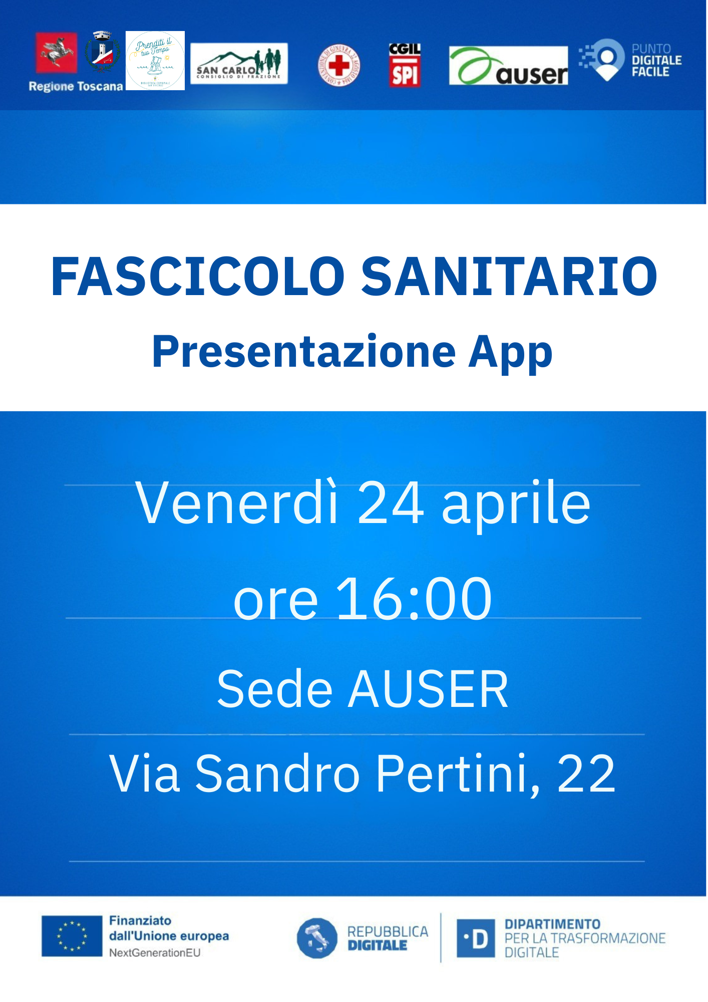 È stato organizzato per venerdì 24 aprile alle ore 16 alla sede dell’Auser, in via Sandro Pertini 22, un evento a partecipazione libera e gratuita dal titolo “Fascicolo sanitario. Presentazione dell’app”.