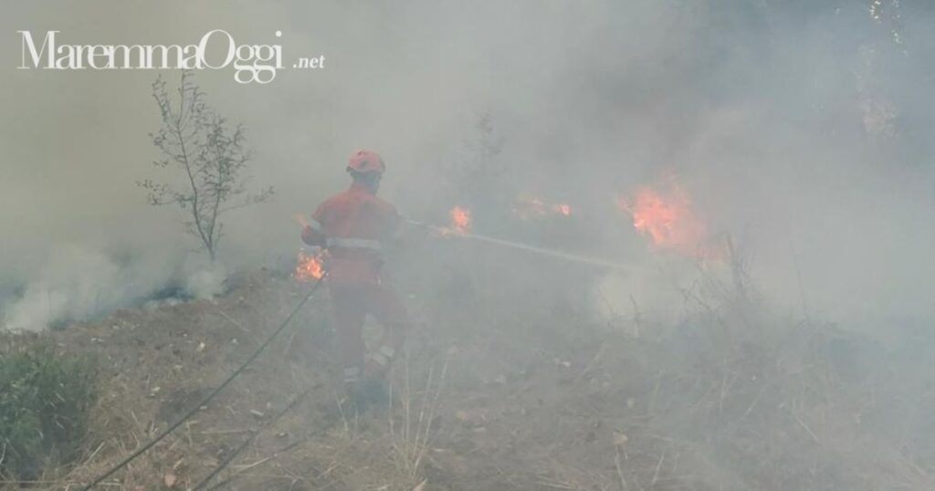PAGANICO. Paura nel pomeriggio di mercoledì 28 agosto per un vasto incendio scoppiato proprio all’ingresso di Paganico. Le fiamme sono partite da dietro il parcheggio dei pullman, a due passi dalla legnaia e si sono propagate a un terreno lì vicino, proprio sulla strada che porta all’ingresso del borgo.