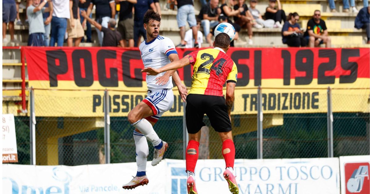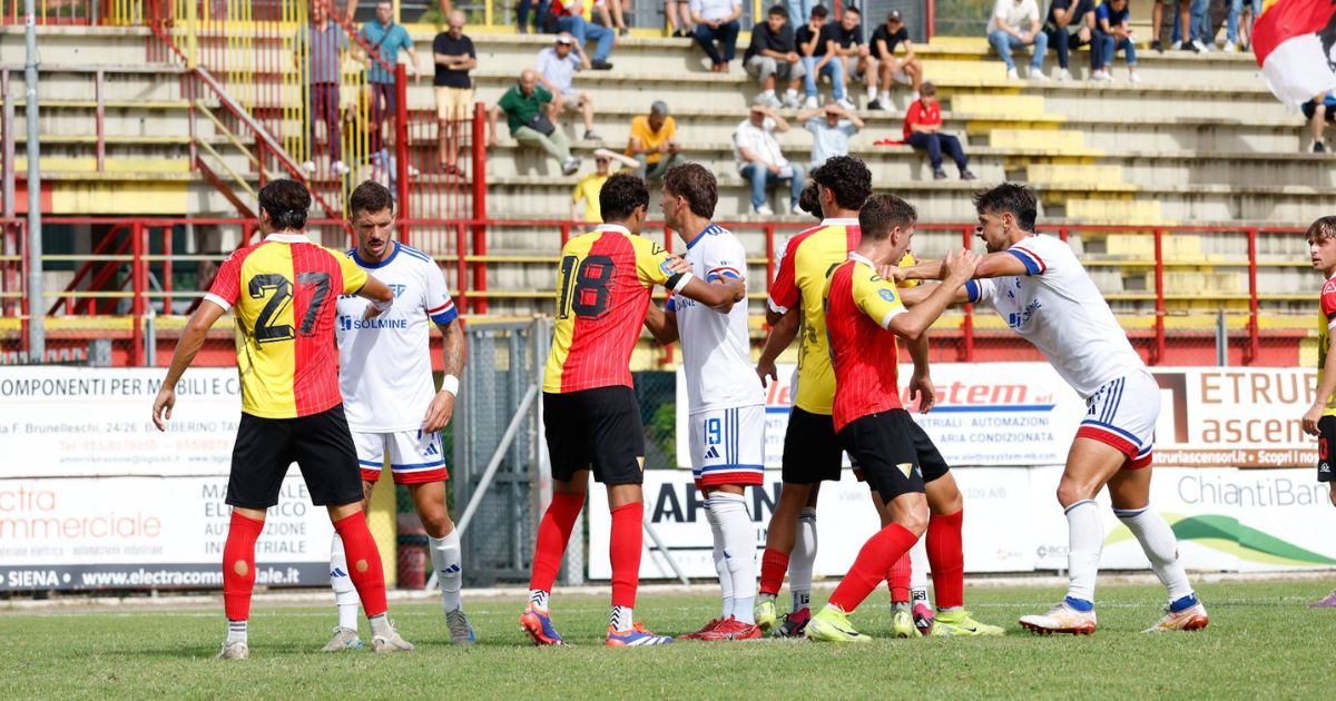 Baiano tiene a riposo Lo Sicco per non rischiare dopo un fastidio muscolare che al 7’ crea la prima occasione da gol: Bianchi si invola sulla sinistra e la mette al centro trovando Remedi, che con il piattone spedisce alto sopra la traversa. Il Poggibonsi si vede invece al 13’ con Gonzi, che tenta una conclusione da fuori che termina lontanissima dallo specchio.