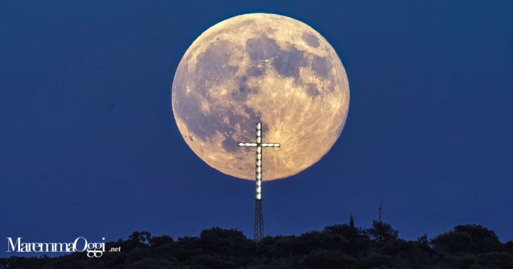Una notte da ricordare: la “luna più grande dell’anno” illuminata dal fotografo Aldo Giuliani dietro alla croce che sorveglia la Maremma