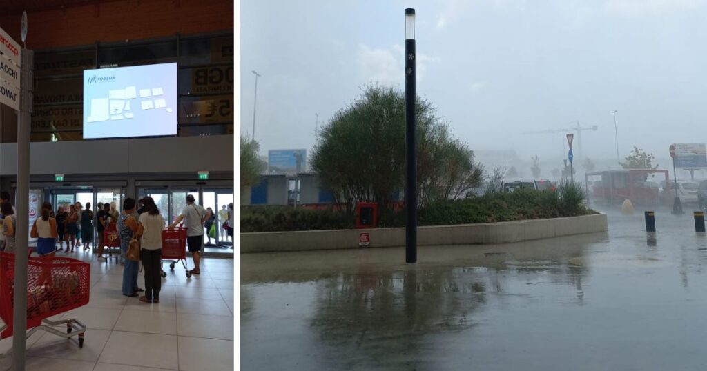 Alle 12.30 circa mentre nella zona del centro commerciale Maremà la pioggia cadeva torrenziale, trattenendo le persone all’interno in attesa che spiovesse per raggiungere le proprie auto, uno spazio tra le nuvole regalava un posto al sole agli abitanti e ai turisti nel centro storico, dove l’arrivo delle precipitazioni si sta facendo attendere.