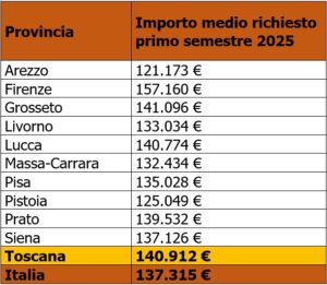 Se Firenze rimane la provincia dove viene chiesto l’importo più alto, 157.160 euro, al secondo posto c’è Grosseto (141.096 euro) e al terzo Lucca con 140.774 euro. Nella graduatoria seguono le province di Prato (139.532 euro), Siena (137.126 euro), Pisa (135.028 euro), seguite ancora da Livorno (133.034 euro) e Massa-Carrara (132.434 euro). Chiudono la classifica regionale le province di Pistoia, dove la cifra media richiesta nel primo semestre dell’anno è stata pari a 125.049 euro, e Arezzo (121.173 euro).