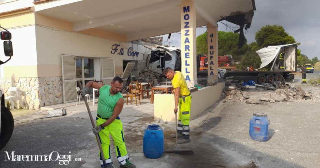 La circolazione, sull’Aurelia, è tornata regolare e nella tarda serata di mercoledì 20 agosto il tir che si è schiantato contro la rivendita di mozzarelle sulla strada statale sarà rimosso